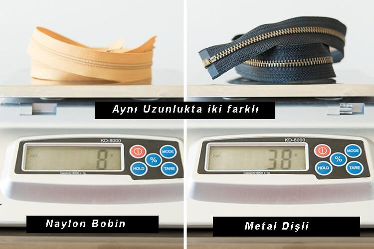 Gördüğünüz gibi, metal dişli fermuar naylon spiral fermuardan 4 kat daha ağırdır. Ürünlerinize fermuar dikmeden önce, bu ağırlığı hesaba katmak isteyeceğinizi düşündük. Daha hafif veya örgü kumaşlarda kullanılacak, metal bir fermuar çok ağır olabilir ve üründe sarkma yapabilir. Bu, durum tasarımınızın estetik görünümünü bozabilir..